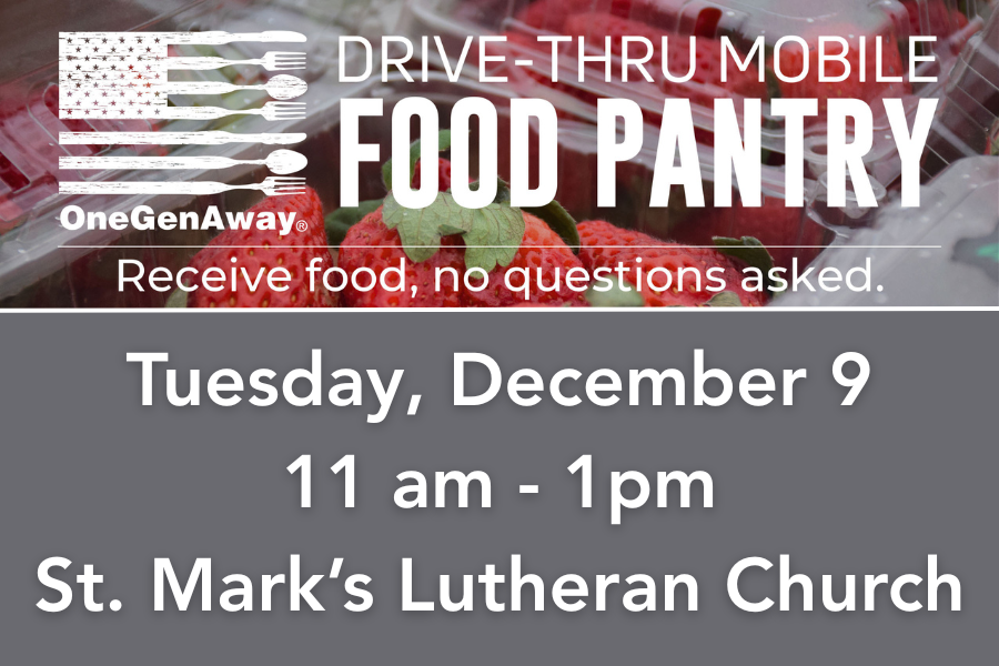 We are excited to announce that on Tuesday, December 9, St. Mark’s is partnering with local non-profit organization One Generation Away for a mid-day food box distribution from 11am – 1pm. Taking place at St. Mark’s, drive-thru style, there will be a free food box (while supplies last) for anyone experiencing food insecurity – no questions asked!